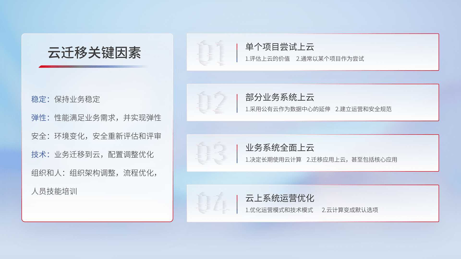 结合实际业务,,,,从规划设计、、云平台选型、、、云原生改造、、、数据迁移、、集成交付,,迁移全过程为客户识别最佳上云路径,,,做好风险识别管理,,,设计网络架构、、、身份权限、、、、安全审计合规、、、、操作审计、、日志审计、、监控告警策略、、、多站点容灾设计等,,对云上基础设施进行整体规划,,提升IT治理水平,,,以满足弹性、、、高可用、、、高性能的需求。。。。