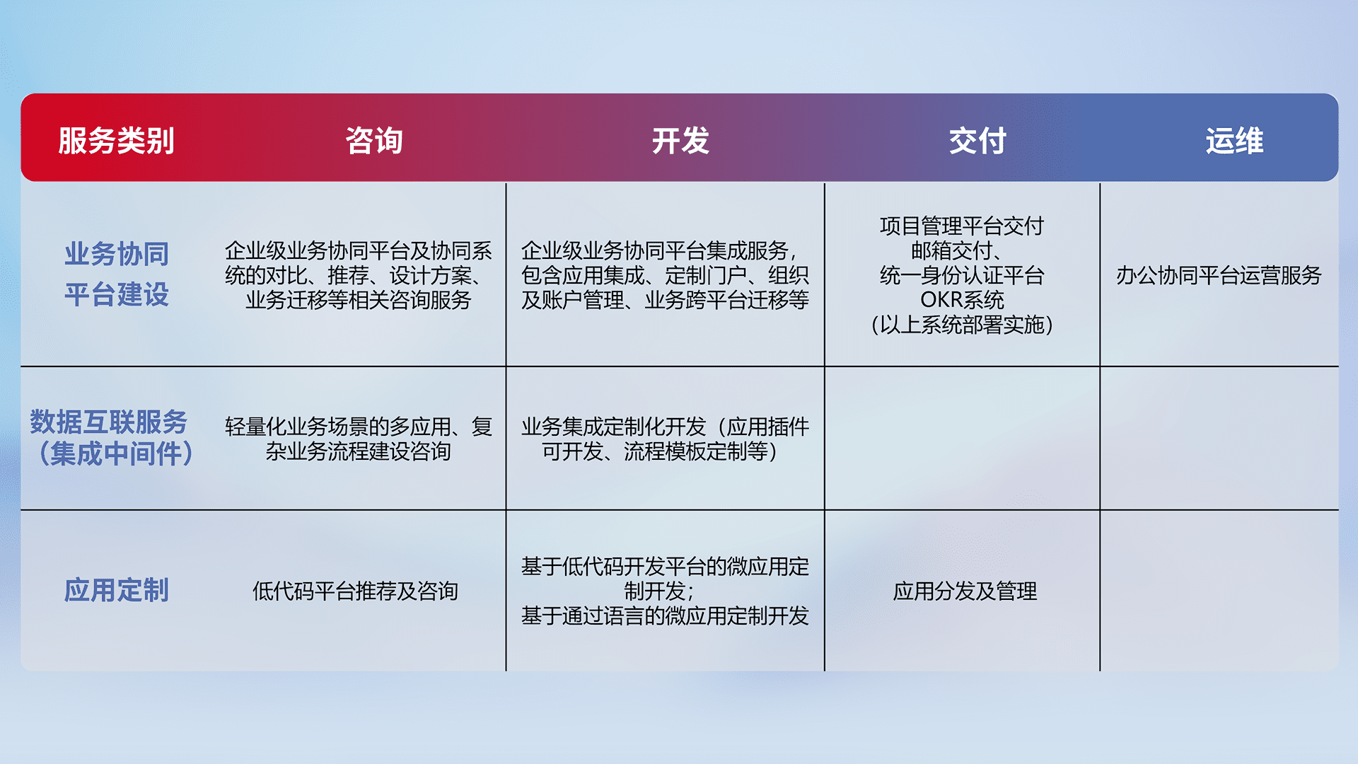 针对钉钉、、、、企微、、、、IDaas等平台级产品提供产品的规划、、、、方案、、交付、、定制化开发等服务,,,,实现如统一协同办公、、、、智能客户服务、、混合会议管理、、智能数据查询、、、、等业务场景,,实现数字化转型。。。